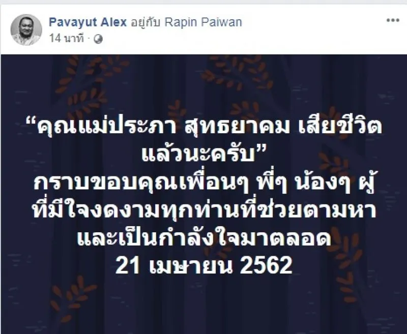 ล่าสุดทางลูกชายได้ออกมาโพสต์ข้อความสุดเศร้า ระบุว่า…“คุณแม่ประภา สุทธยาคม เสียชีวิตแล้วนะครับ” กราบขอบคุณเพื่อนๆ พี่ๆ น้องๆ ผู้ที่มีใจงดงามทุกท่านที่ช่วยตามหาและเป็นกำลังใจมาตลอด 21 เมษายน 2562