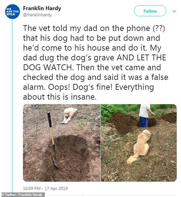 Franklin Hardy นักเขียนรายการโทรทัศน์ได้แบ่งปันภาพถ่ายของพ่อตัวเองบน Twitter ขณะกำลังขุดหลุมฝังศพสำหรับสุนัขของครอบครัว พร้อมกับระบุว่า 'สัตวแพทย์โทรมาบอกพ่อของฉันทางโทรศัพท์ว่าสุนัขของเขาจะต้องถูกทำให้เสียชีวิตในเร็วๆนี้'