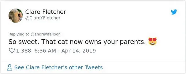 เท่านั้นไม่พอทางด้าน Andrew เมื่อได้รับภาพถ่ายจากคุณแม่ว่ามีแมวมานอนกอดคุณพ่อของเขาระหว่างหลับ ก็ได้อัพโหลดลงทวิตเตอร์และคิดว่าเรื่องราวนี้อาจจะทำให้ใครยิ้มได้ แต่มันกลายเป็นเรื่องราวโด่งดังบนโลกออนไลน์อย่างรวดเร็ว ซึ่งหลังจากลงไปเพียงไม่กี่ชั่วโมงก็มีคนรีทวิตมากถึงสองพันครั้ง จนกระทั่งถึงตอนนี้มีคนรีทวิตไปแล้วมากกว่าแปดพันครั้ง