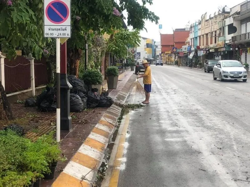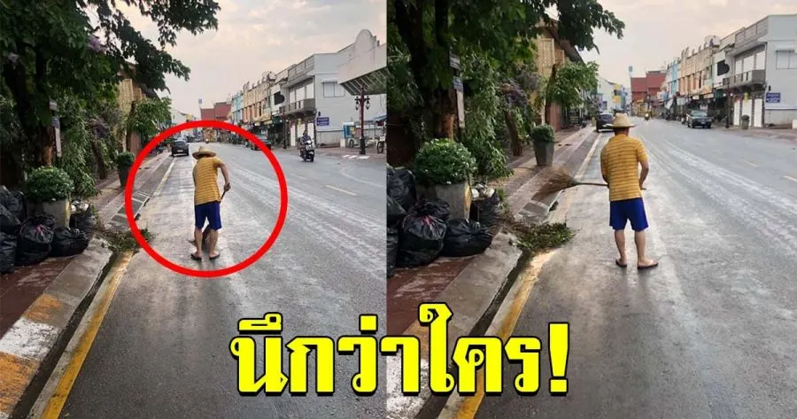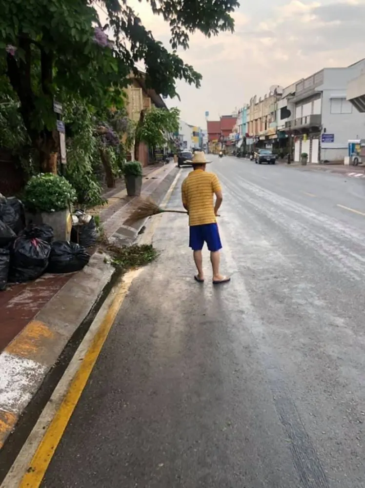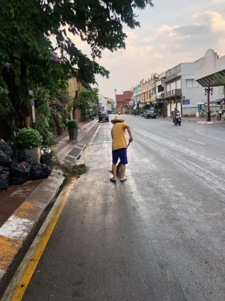 ชายหนุ่ม สวมรองเท้าแตะ คว้าไม้กวาดทำความสะอาดริมถนน หลังฝนถล่มเมือง พอหันหน้ามาชัดๆ ยกนิ้วให้เลย