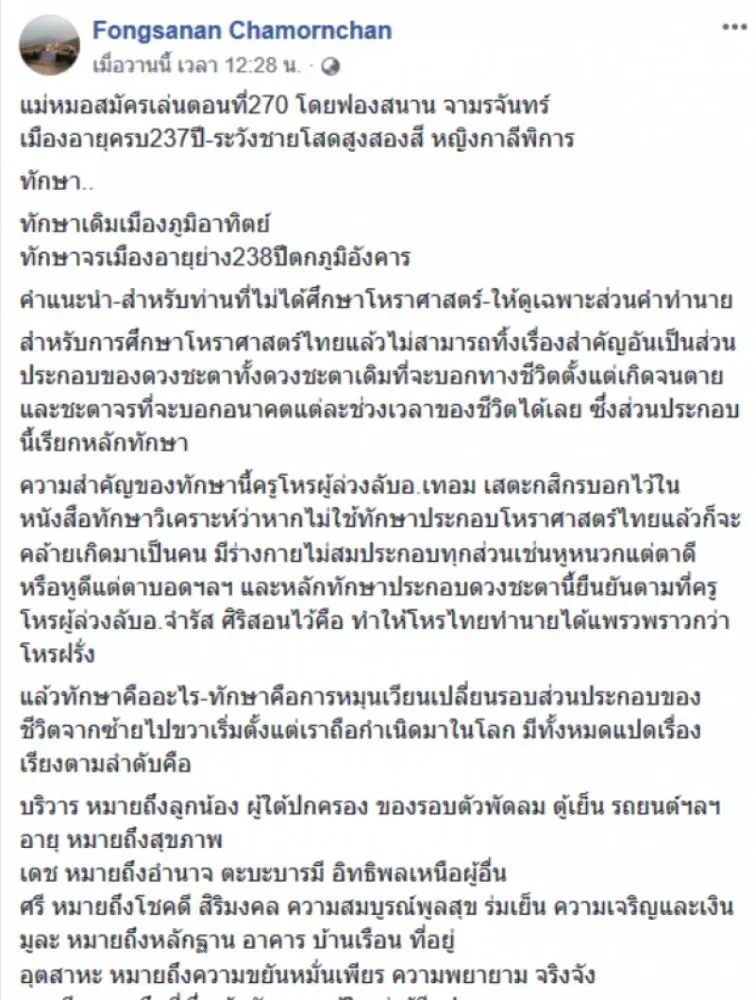 วันที่ 22 เมษายน 2562 ผู้สื่อข่าวรายงานว่า ผู้ใช้เฟซบุ๊กชื่อ Fongsanan Chamornchan ได้โพสต์ข้อความระบุว่า แม่หมอสมัครเล่นตอนที่270 โดยฟองสนาน จามรจันทร์