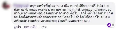 "หนูคนหนึ่งที่ยุในงาน,เรามีอาหารให้กินแจกฟรี,ให้ความสุขครบฟรีทุกอย่าง,เพราะหน่วยงานทุกงานมีช่วยกันออกเงินกันเยอะมาก,พวกหนูอดหลับอดนอนทำอาหารเพื่อไปแจกให้พี่น้องคนไทยกันคะ,คิดถึงสวนร่วมด้วยก่อนจะทำอะไรลงไป,ถ้าคิดได้ก็อย่าไปคะ,คนเตรียมจัดงานยริการแทบตายแต่ผลกับออกมาทางลบ"