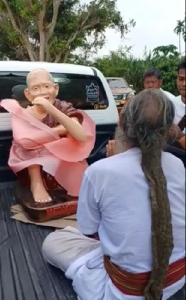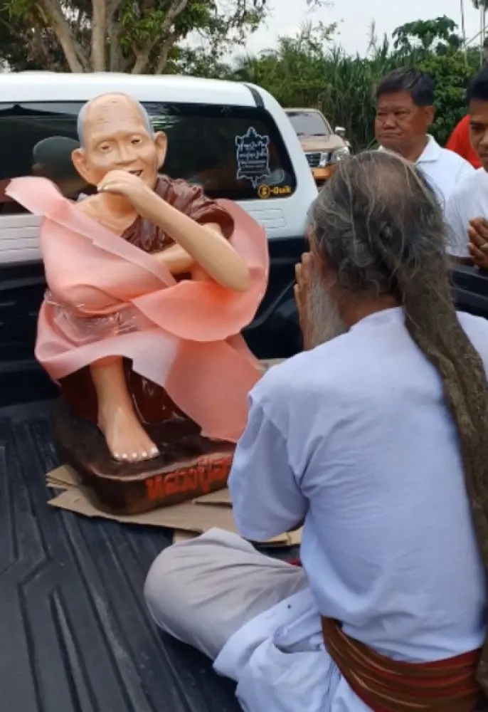 ชาวบ้านแห่สาธุท่วมหัว อัญเชิญ รูปปั้น หลวงปู่สรวง เทวดาเดินดิน ขนาดเท่าองค์จริง เลขทะเบียนรถเข้าตาเต็มๆ