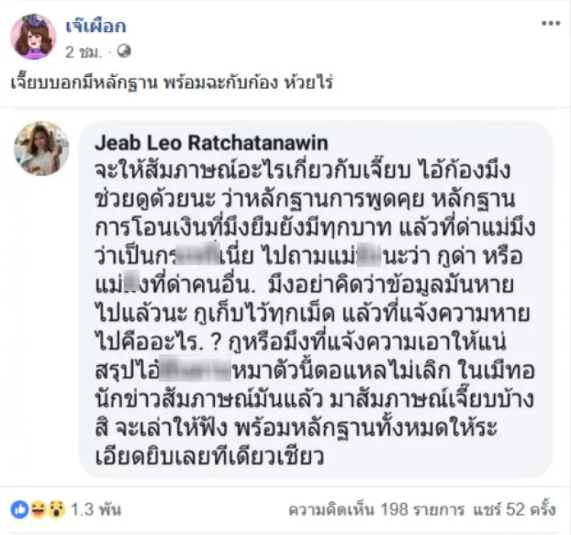 ล่าสุด เพจ เจ๊เผือก ได้เผยโพสต์ของ ผู้ใช้เฟซบุ๊ก Jeab Leo Ratchatanawin ผู้หญิงที่คาดว่าก้องกล่าวอ้างถึงเอาไว้ว่า