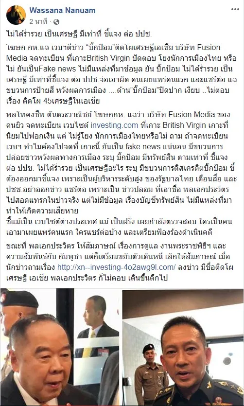วันที่ 22 เม.ย. พล.ท.คงชีพ ตันตระวาณิชย์ โฆษกกระทรวงกลาโหม เปิดเผยถึงกรณีข่าวต่างประเทศจาก เว็บไซด์อินเวสติ้ง ได้มีการเผยแพร่ข้อมูล โดยนำชื่อของ พล.อ.ประวิตร วงษ์สุวรรณ รองนายกรัฐมนตรี และรมว.กลาโหม เข้าไปเชื่อมโยงกับรายชื่อบุคคลร่ำรวยระดับเศรษฐี ของทวีปเอเชีย จำนวน 45 คน ซึ่งขาดข้อมูลอ้างอิงประกอบ ชี้้ข้อมูลดังกล่าวเป็นเท็จ