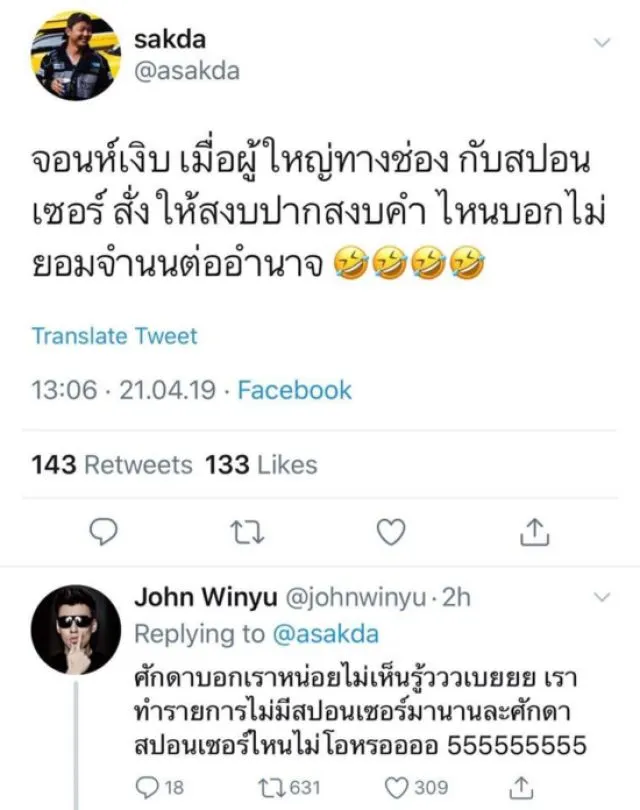 ทั้งนี้ จอห์น วิญญูได้เข้ามาตอบข้อเท็จจริง ของเรื่องนี้ โดยระบุสั้นๆว่า ศักดาบอกเราหน่อยไม่เห็นรู้วววเบยยย เราทำรายการไม่มีสปอนเซอร์มานานละศักดา สปอนเซอร์ไหนไม่โอหรออออ 555555555