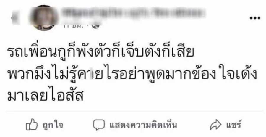 ขณะที่เฟซบุ๊กที่ใช้ชื่อเหมือนกันกับเฟซบุ๊กผู้ก่อเหตุก็คอมเม้นท์เช่นกันว่า ด่าเพื่อกูทำค_ยไรไอ้สั_ และได้คอมเม้นท์เพิ่มเติมอีกว่า เรื่องของกูกูจะชนใครก็ได้ ไม่ได้ขอเงินใคร อย่างไรก็ตาม มีคอมเม้นท์มาโต้ว่าคอมเม้นท์ดังกล่าวเป็นเฟซบุ๊กปลอม