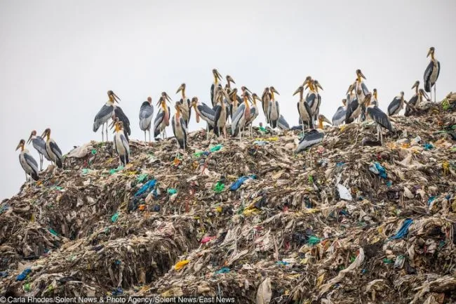 2 นกกระสาที่ใกล้สูญพันธุ์หลายสิบตัวยืนอยู่บนกองขยะขนาดใหญ่