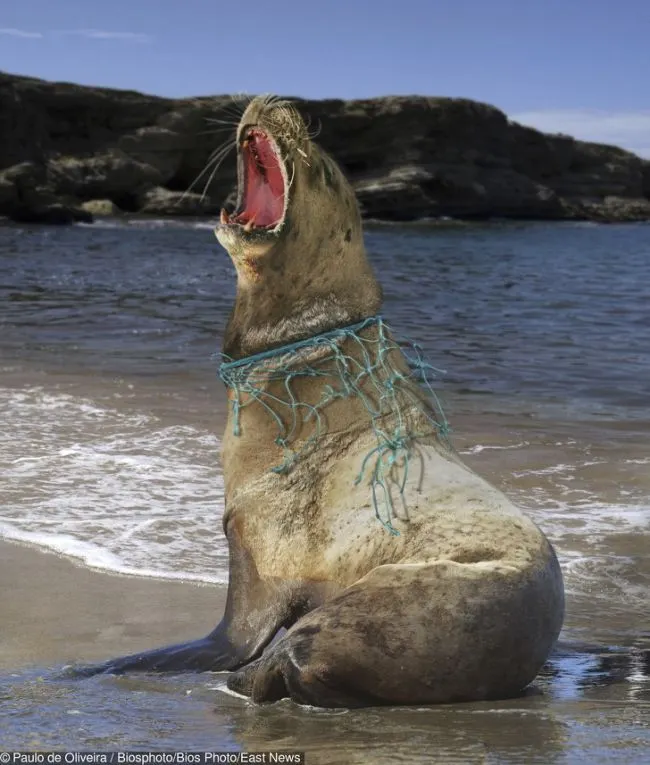 12 สิงโตทะเลที่ถูกอวนจับปลาคล้องอยู่รอบคอของมัน