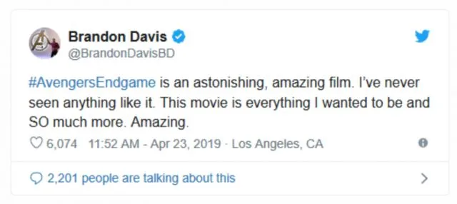 หนัง Avengers: Endgame เป็นหนังที่ทำให้รู้สึกตื่นตาตื่นใจจริง ๆ มันยอดเยี่ยมมาก เราไม่เคยเห็นอะไรแบบนี้มาก่อน หนังเรื่องนี้มีทุกสิ่งทุกอย่างที่อยากให้มีและมีมากกว่านั้นอีก เจ๋งมาก ๆ