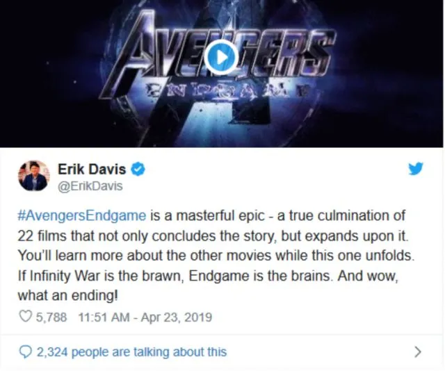 เรียกได้ว่าเป็นมหากาพย์ภาพยนตร์ฟอร์มยักษ์แห่งปีเลยก็ว่าได้ สำหรับหนังซุปเปอร์ฮีโร่จากทางค่ายมาเวลที่ทั่วทั้งโลกเฝ้ารอคอยอย่าง "Avengers Endgame" ที่กำลังจะเปิดฉายในวันที่ 24 เมษายนนี้ เพียงแค่ปล่อยตัวอย่างออกมาก็สร้างความฮือฮา และกระตุ้นความรู้สึกของแฟนหนัง ที่อยากจะเข้าไปชมกันเต็มที โดยในวันนี้ทางทีมงานจึงได้นำความคิดเห็นบางส่วน จากนักวิจารณ์ รวมถึงสื่อมวลชนบางส่วนได้มีโอกาสเข้าชมหนังเรื่องนี้ก่อนใครในโลกมาให้ได้อ่านกัน ว่าหลังจากที่พวกเขาได้ดูแล้วรู้สึกประทับใจกับหนังเรื่องนี้อย่างไรบ้าง เรียกได้ว่าหากแฟนๆได้อ่านคงต้องรู้สึกตื่นเต้นมากยิ่งขึ้นแน่นอน