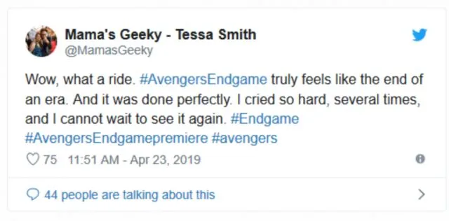 ว้าว หนัง Avengers: Endgame ให้ความรู้สึกเหมือนว่าเป็นจุดสิ้นสุดของยุคสมัย และมันสิ้นสุดได้อย่างสมบูรณ์แบบ เราร้องไห้หนักมาก หลาย ๆ ครั้ง และรอไม่ไหวแล้วที่จะได้ดูอีกรอบ