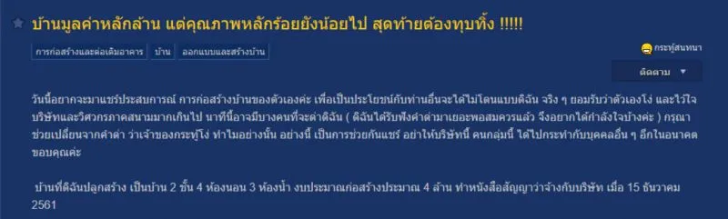 วันที่ 24 เมษายน 2562 ผู้สื่อข่าวรายงานว่า สมาชิกเว็ปไซต์ พันทิป รายหนึ่ง ได้ออกมาแชร์ประสบการณ์ในการสร้างบ้าน เชื่อว่าหลายๆคนตอนนี้กำลังเก็บเงินทำบ้านสร้างที่อยู่อาศัยกัยอยู่ใช่ไหมละคะ ลองมาอ่านโพสต์นี้เผื่อได้ข้อคิดและข้อระวังนำไปใช้ โดยผู้ใช้ดังกล่าวเผยหัวข้อว่า บ้านมูลค่าหลักล้าน แต่คุณภาพหลักร้อยยังน้อยไป สุดท้ายต้องทุบทิ้ง !!!!!