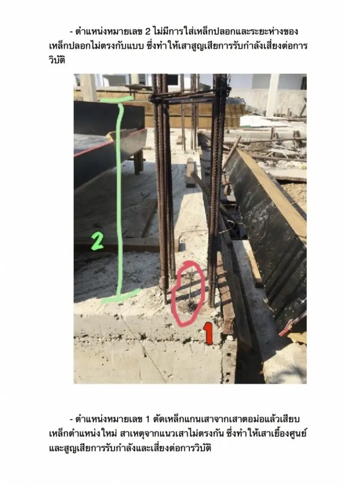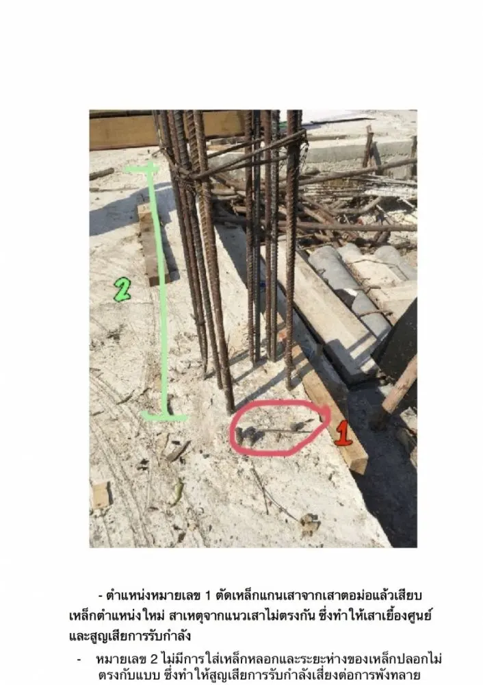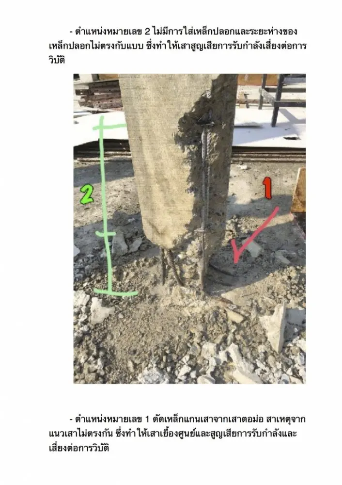 - ไม่มีการใส่เหล็กปลอก และระยะห่างของเหล็กปลอกไม่ตรงกับแบบ ซึ่งทำให้เสาสูญเสียการรับกำลังและเสี่ยงต่อการพังทลาย