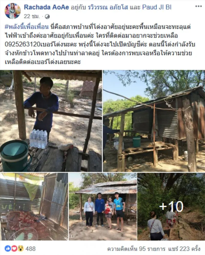 ล่าสุดวันที่ 23 เมษายน 2562 ที่ผ่านมา เฟซบุ๊กชื่อ Rachada AoAe ได้โพสต์เล่าต่ออีกว่า #พลังนี้เพื่อเพื่อน นี่คือสภาพบ้านที่โด่งอาศัยอยู่นะคะพื้นเหมือนจะทะลุแต่ไฟฟ้าเข้าถึงค่ะอาศัยอยู่กับเพื่อนค่ะ ใครที่ติดต่อมาอยากจะช่วยเหลือ 0925263120 เบอร์โด่งนะคะ พรุ่งนี้โด่งจะไปเปิดบัญชีค่ะ ตอนนี้โด่งกำลังรับจ้างหักข้าวโพดทางไปบ้านท่าลาดอยู่ ใครต้องการพบเจอหรือให้ความช่วยเหลือติดต่อเบอร์โด่งเลยนะคะ