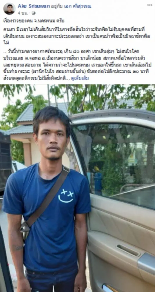 วันนี้ท่ามกลางอากาศร้อนระอุ เกิน ๔๐ องศา เขาเดินดุ่มๆ ไม่สนใจใคร บริเวณเลยจาก.จอหอ มาเล็กน้อย สภาพเหงื่อไหลท่วมตัว เลยหยุดรถสอบถาม ได้ความว่าจะไปนครพนม เราบอกให้ขึ้นรถ เขาเดินอ้อมไปขึ้นท้ายกระบะ (เรานึกในใจ สอบผ่านขั้นต้น) ขับรถต่อไปอีกประมาณ ๒๐ นาที สังเกตดูพฤติกรรมไม่มีสื่งผิดปกติ เลยแวะร้านริมถนน ซื้อไก่ย่าง ๑ ตัว ข้าวเหนียว น้ำดื่มขวดใหญ่ และบอกให้เขามานั่งในรถ บอกให้เขาทานข้าวที่ซื้อมาให้ เขาบอกทานเมื่อเช้าแล้ว แต่ก็ให้ไว้ หิวเมื่อไรก็ทานได้เลย
