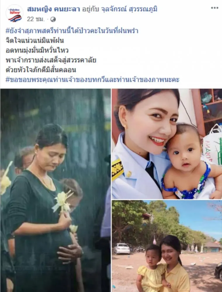 วันที่ 24 เมษายน 2562 ผู้สื่อข่าวรายงานว่า โลกออนไลน์มีการแชร์เรื่องราวของผู้ใช้เฟซบุ๊กชื่อ สมหญิง คนยะลา ซึ่งเป็นภาพของหญิงสาวคนหนึ่งโดยระบุข้อความว่า ยังจำสุภาพสตรีท่านนี้ได้ป่าวคะในวันที่ฝนพรำ จิตใจแน่วแน่มิแพ้ฝน อดทนมุ่งมั่นมิหวั่นไหว พาเจ้ากราบส่งเสด็จสู่สวรรคาลัย ด้วยหัวใจภักดีมิสั่นคลอน #ขอขอบพระคุณท่านเจ้าของบทกวีและท่านเจ้าของภาพนะคะ