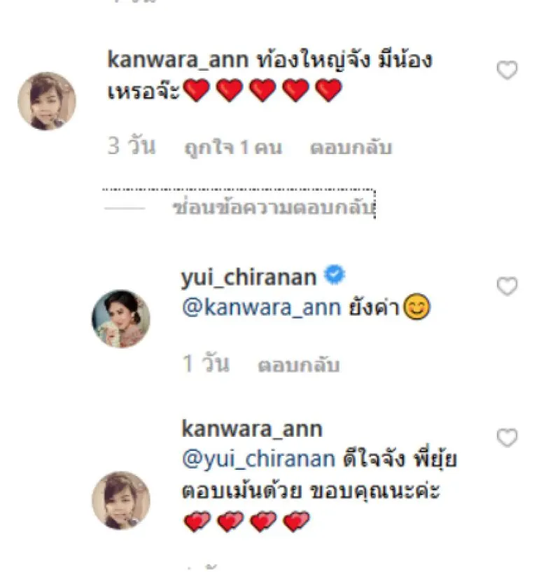 ซึ่ง ยุ้ย จีรนันท์ ไม่ได้ปล่อยให้หลายคนลุ้นกันนานหรือคาดเดาไปต่างๆ นานา โดยเธอได้ตอบกลับคอมเมนต์ดังกล่าวว่า "ยังค่า" เป็นอันว่าหมดลุ้นกันไปเลย