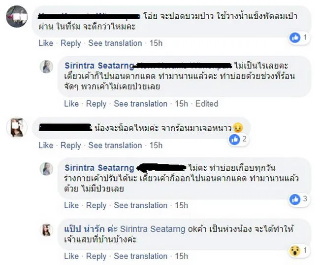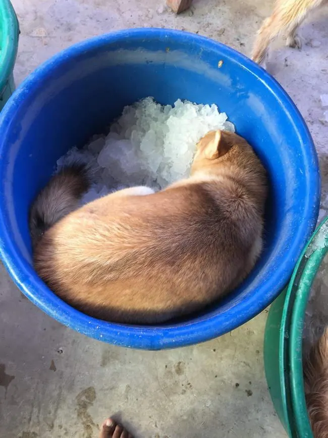 สำหรับผู้ใช้เฟสบุ๊คที่มีชื่อว่า Sirintra Seatarng ได้แบ่งปันลงในกลุ่มรักหมาถึงวิธีการที่เธอมักจะใช้คลายร้อนให้กับสุนัขที่บ้านที่เลี้ยงไว้หลายตัวก้คือสั่งน้ำแข็งมาและใส่กะละมังให้น้องหมาได้ไปเล่นคลายร้อนกัน