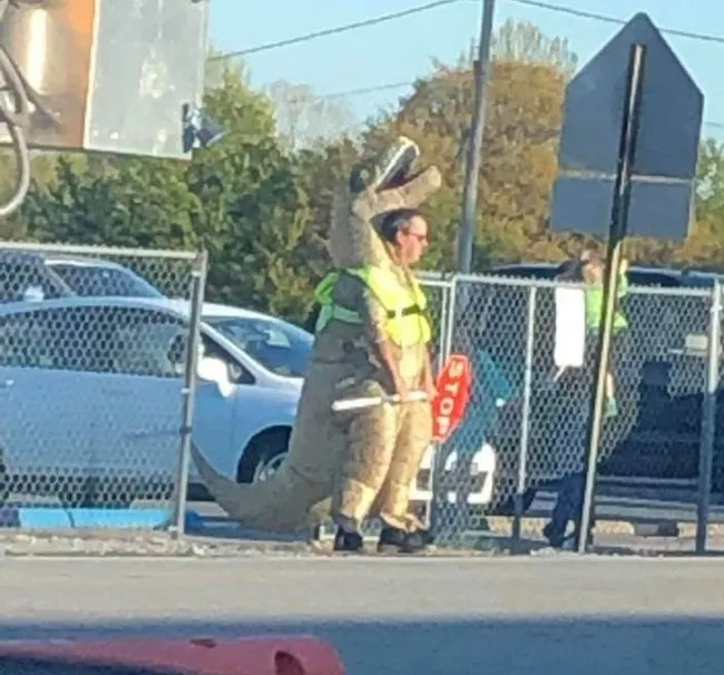 1 “ นี่คืออาจารย์ใหญ่ที่โรงเรียนที่ลูกของฉันเรียนอยู่ เขาแต่งตัวเป็น T-rex ”