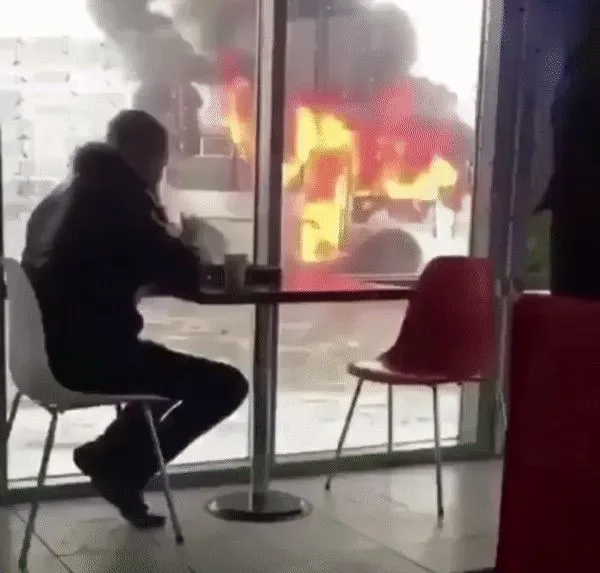 3 ชายคนนี้นั่งกินข้าวอย่างเอร็ดอร่อย แม้ว่าจะมีรถบรรทุกที่ไฟกำลังไหม้อยู่ต่อหน้าต่อตา เขายังนั่งกินอยู่นิ่งๆไม่ใส่ใจ