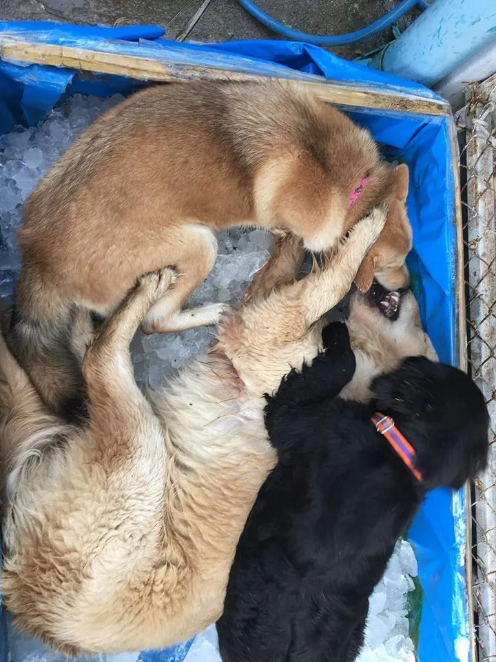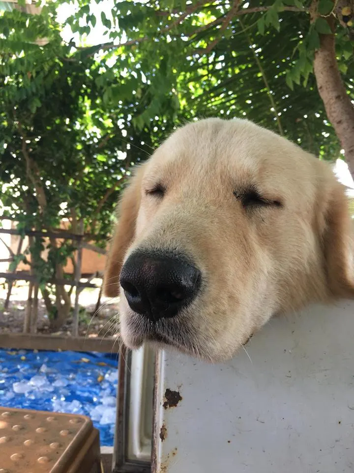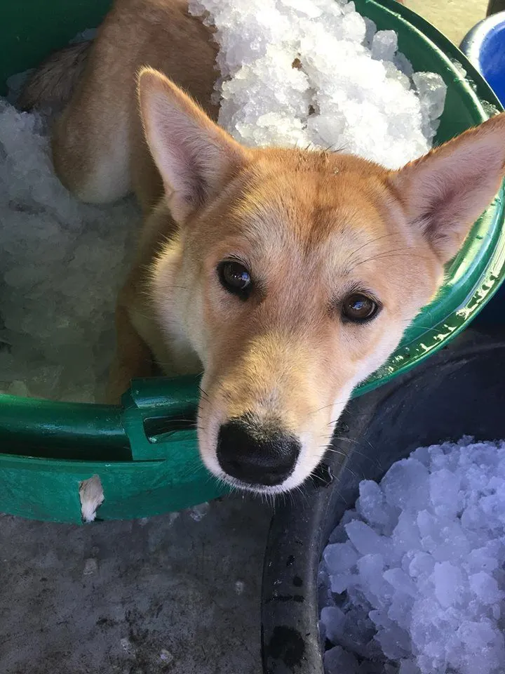โดยน้องหมาแต่ละตัว จะมีถังแช่น้ำแข็งประจำตำแหน่ง พอกลางวันอากาศเริ่มร้อนจัด มันก็จะลงไปนอนแช่น้ำแข็งอย่างสบายใจ