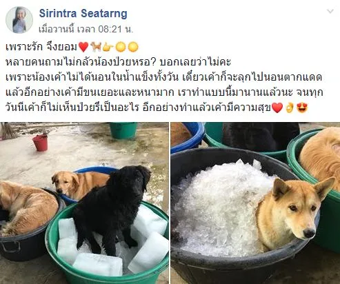และก็เจ้าของสุนัขรายหนึ่ง เปิดเผยไอเดียป้องกันโรคฮีทสโตรก ที่อาจจะเกิดกับสุนัขในหน้าร้อนนี้ ระบุว่า ” เพราะรัก จึงยอม หลายคนถามไม่กลัวน้องป่วยหรอ? บอกเลยว่าไม่คะ เพราะน้องเค้าไม่ได้นอนในน้ำแข็งทั้งวัน เดี๋ยวเค้าก็จะลุกไปนอนตากแดด แล้วอีกอย่างเค้ามีขนเยอะและหนามาก เราทำแบบนี้มานานแล้วนะ จนทุกวันนี้เค้าก็ไม่เห็นป่วยรึเป็นอะไร อีกอย่างทำแล้วเค้ามีความสุข”