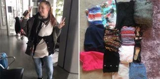 โดยเธอสวมชุดเดรสไป 4 ชุด กางเกงขาสั้น 2 ตัว ใส่กระโปรงทับต่ออีกที และนำชุดเดรสอีกชุดหนึ่งมาผูกห้อยคอไว้ จากนั้นสวมรองเท้าซ้อนกัน 2 คู่ และปิดท้ายด้วยการนำเสื้อหนาวมาใส่อีกชั้นหนึ่ง