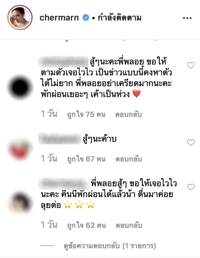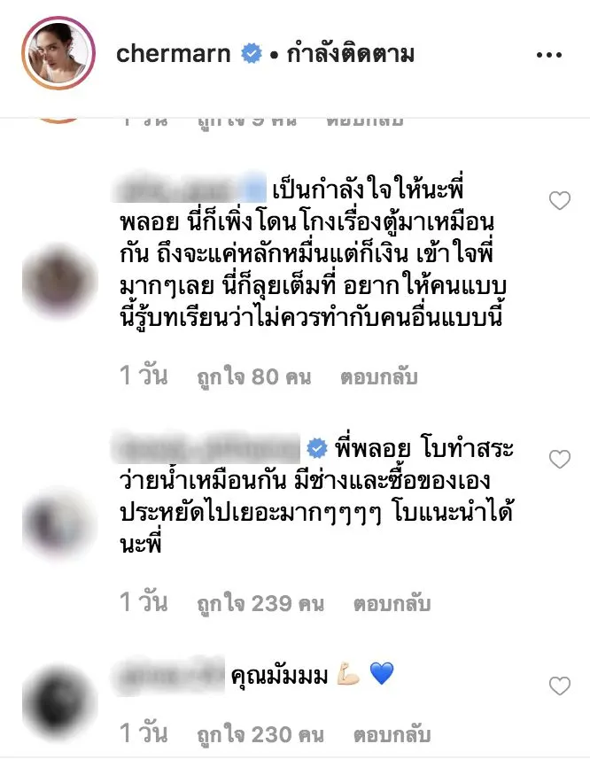 จากโพสที่ สาวพลอย ได้โพสเล่าเรื่องราวทั้งหมดไปนั้นก็ได้มีทั้งคนในวงการบันเทิงและแฟนคลับได้เข้ามาคอมเม็นต์ให้กำลังใจสาวพลอยเป็นจำนวนมาก และเชียร์ให้สาวพลอยดำเนินคดีกับคนร้ายให้ได้ แต่อย่างไรก็ตามทาง โน้ต ผจก.พลอย เฌอมาลย์ ได้ออกมาชี้แจ้งผ่านสื่อ จากประเด็นเรื่องสร้างสระว่ายน้ำที่ สาวพลอย จ้างผู้รับเหมา แล้วเกิดปัญหา ณ ตอนนี้ขอรวบรวมข้อมูล และจะนัดสัมภาษณ์พี่ๆ สื่อมวลชนอีกครั้งอย่างแน่นอน