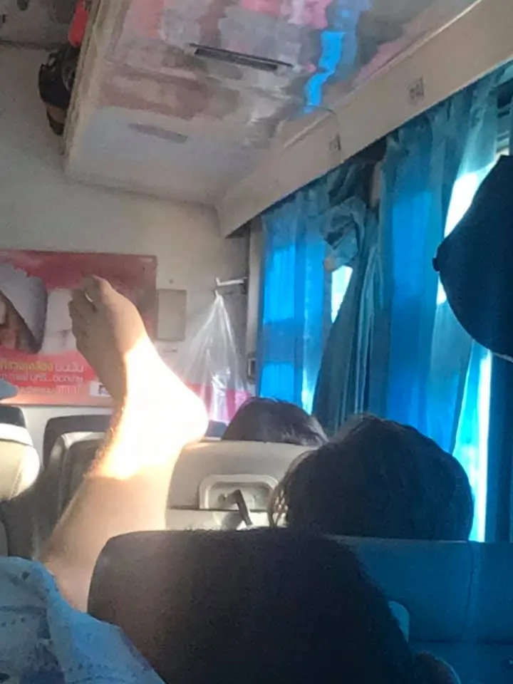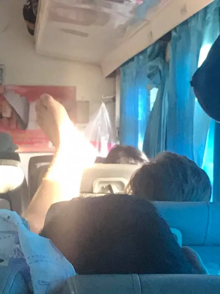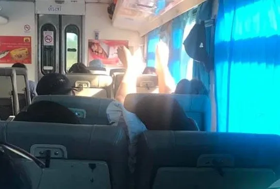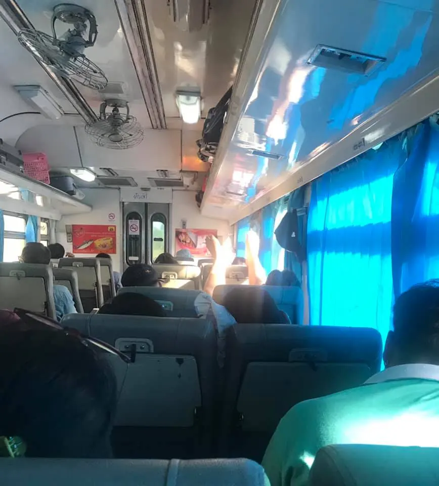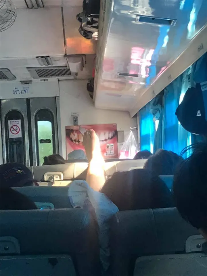 รถไฟด่วนพิเศษ กรุงเทพ-สุราษฎร์ธานี ผู้โดยสารที่ยกขาพาดไม่ใช่คนไทย น่าสงสารคนที่นั่งเก้าอี้ตัวหน้า