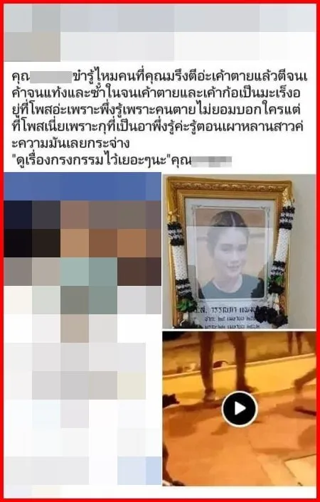 ถือเป็นอีกหนึ่งเรื่องราวสุดสลดใจที่สุดในเวลานี้ เมื่อชาวเน็ตสาวรายหนึ่งออกมาโพสต์เรียกร้องความเป็นธรรมหลังหลานสาวที่กำลังตั้งท้อง ถูกรุมทำร้ายร่างกาย ช้ำในหนักจนเสียชีวิต "คุณ...ข๋า รูไหมคนที่คุณมรึงตีอ่ะ เค้าตายแล้วตีจนเค้าจนแท้ง และช้ำใน จนเค้าตายและเค้าก้อเป็นมะเร็งอยู่ที่โพสอ่ะ เพราะพึ่งรู้เหราะคนตายไม่ยอมบอกใคร แต่ที่โพสตเนี่ยเพราะหุที่เป็นอาพึ่งรู้ค่ะ รู้คอนเผาหลานสาวค่ะ ความมันเลยกระจ่าง "ดูเรื่องกรงกรรมไว้เยอะๆนะ" คุณ..."