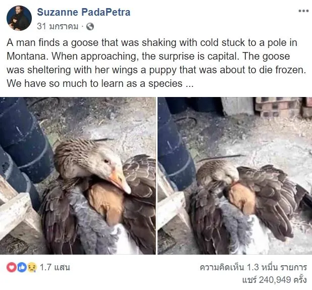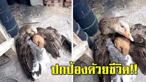 ห่านแสนรู้กางปีก บังลมให้ลูกหมา แม้ตัวเองจะหนาวแค่ไหน แต่ก็ยอมอดทนปกป้อง