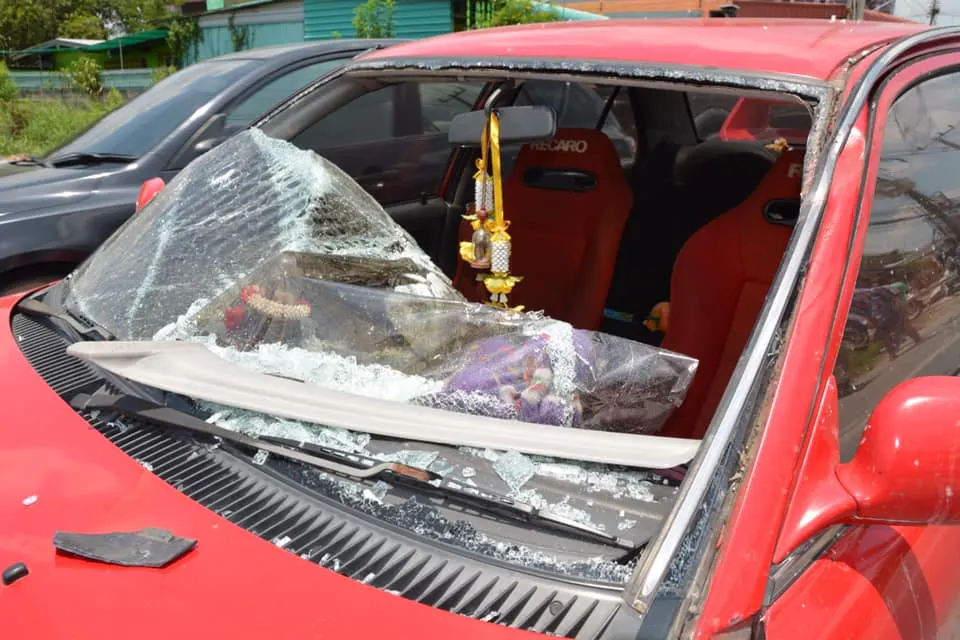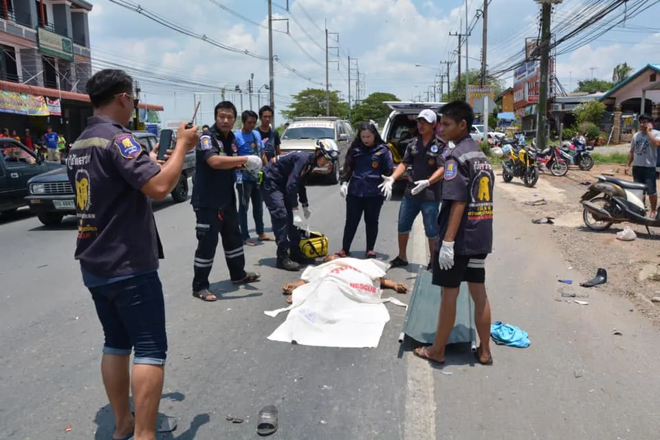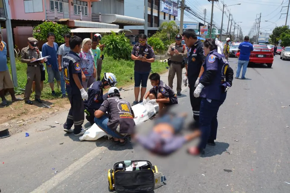 ห่างกันกับรถเก๋งประมาณ 10 เมตรพบรถ จยย.ฮอนด้าเวฟ 125 สีน้ำเงิน ทะเบียน คขว 344 ชลบุรี ล้มอยู่ข้างทางสภาพพังยับเป็นเศษเหล็กทั้งคันส่วนคนขับรถ จยย.ชื่อนายชาตรี ไมตรีจิตร์ อายุ 49 ปี อยู่บ้านเลขที่ 19/2 หมู่ 2 ต.นามะตูม อ.พนัสนิคม จ.ชลบุรี นอนเสียชีวิตอยู่กลางถนน สภาพศรีษะแตก หน้าอกมีแผลฉีกขาดฉกรรจ์ ขาทั้ง 2 ข้างหัก