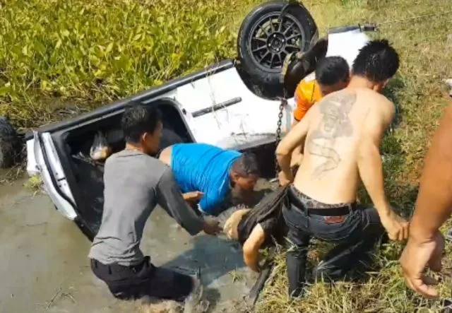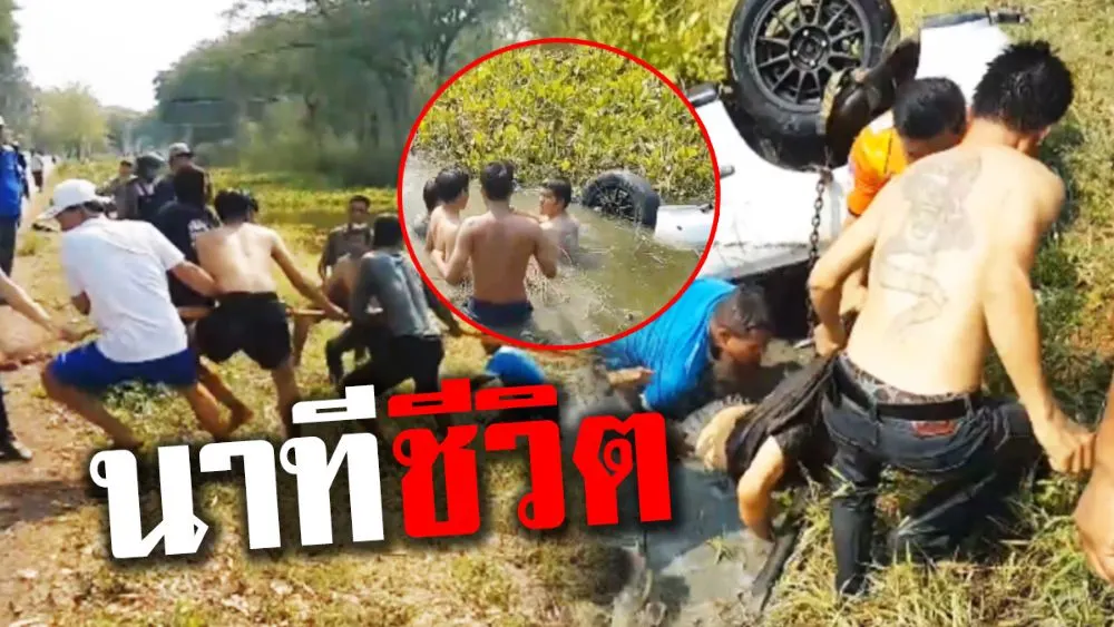 ช่วยกันเร็ว ชาวบ้านช่วยเก๋งตกน้ำ จมมิดคัน คนขับดิ้นทุรนคารถ จนท.ช่วยกันยื้อสุดชีวิต