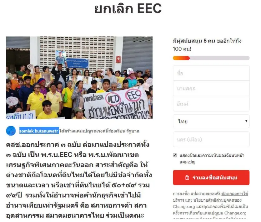มีประเด็น "รณรงค์ยกเลิก EEC" ใน www.change.org ดร.โสภณเห็นด้วย จึงขอร่วมรณรงค์ให้ยกเลิกเขตเศรษฐกิจพิเศษภาคตะวันออก (EEC: Easter Economic Corridor)