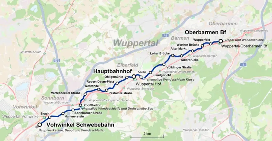 แผนที่เส้นทางรถไฟฟ้า Wuppertal Suspension Railway