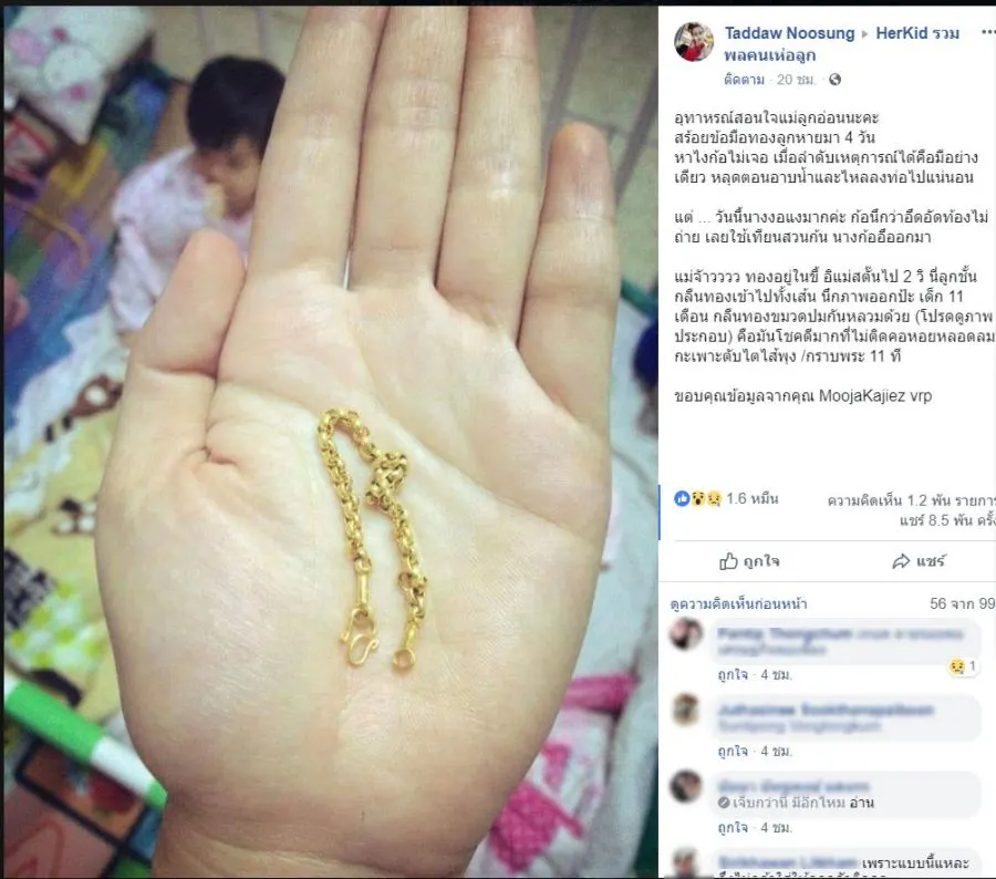 ล่าสุดผู้ใช้เฟชบุคชื่อ Taddaw Noosung ได้แชร์ประสบการณ์ที่ไม่คาดคิดไว้ว่า อุทาหรณ์สอนใจแม่ลูกอ่อนนะคะ สร้อยข้อมือทองลูกหายมา 4 วันหาไงก้อไม่เจอ เมื่อลำดับเหตุการณ์ได้คือมีอย่างเดียว หลุดตอนอาบน้ำและไหลลงท่อไปแน่นอน แต่วันนี้นางงอแงมากค่ะ ก้อนึกว่าอึดอัดท้องไม่ถ่าย เลยใช้เทียนสวนก้น นางก้ออึออกมา