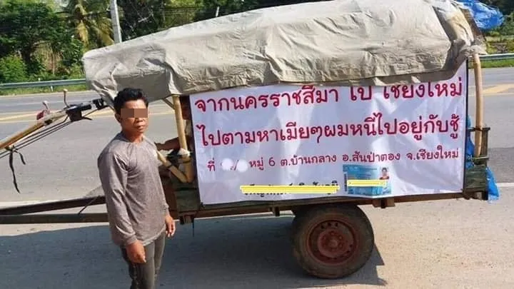 29 เม.ย.2562 หนุ่มใหญ่เดินทางพร้อมลูกจากจังหวัดนครราชสีมา ขณะนี้ผ่านจังหวัดชัยภูมิ เพื่อที่จะไปตามหาภรรยา โดยขับรถไถพ่วง เขียนป้ายข้างรถระบุชัดเจน จากนครราชสีมา-เชียงใหม่ ไปตามหาเมีย เมียผมหนีไปอยู่กับชู้ โดยระบุชื่อเมียตามด้านข้างของรถ
