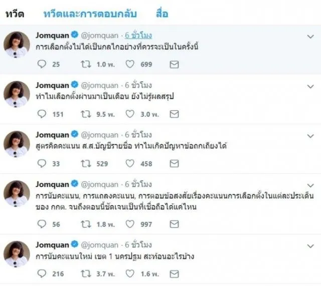 จอมขวัญ หลาวเพ็ชร นักข่าวสาวสวยชื่อดัง ได้ทวีตข้อความผ่านทาง ทวิตเตอร์ ของเธอเอง @jomquan รัวๆ กว่า 5 ครั้ง ถึงผลคะแนนการเลือกตั้ง ดังนี้