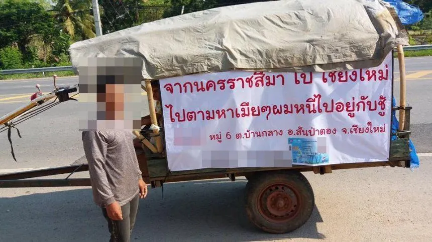 "ชัยภูมิ 29เม.ย.62 ชายหนุ่มผู้จากบ้านจากจังหวัดนครราชสีมา ขณะนี้ผ่านจังหวัดชัยภูมิ เพื่อที่จะไปตามหาภรรยา เดินทางพร้อมลูก โดยขับรถไถพ่วง เขียนป้ายข้างรถระบุชัดเจน จากนครราชสีมา ไป เชียงใหม่ ไปตามหาเมีย เมียผมหนีไปอยู่กับชู้ โดยระบุชื่อเมียตามด้านข้าง ของรถ แอดขอเป็นกำลังใจให้พี่และลูก เพื่อตามหาภรรยาด้วยนะคะ"