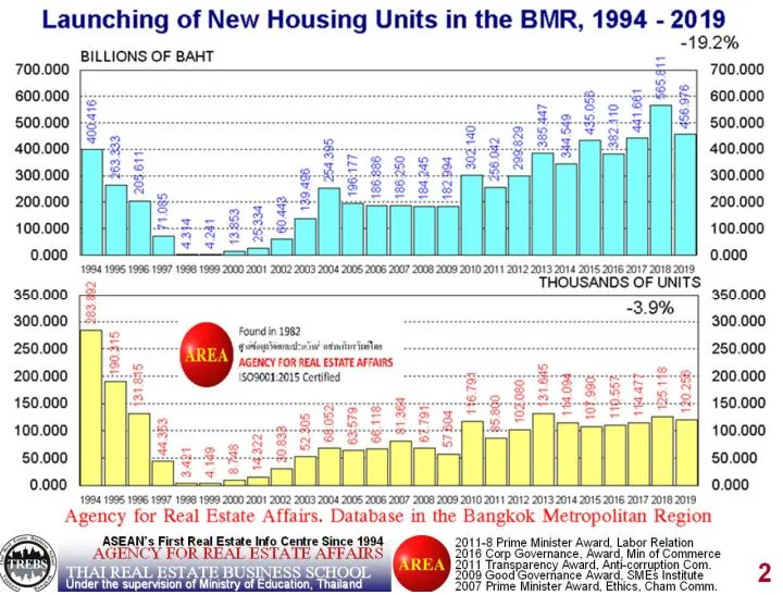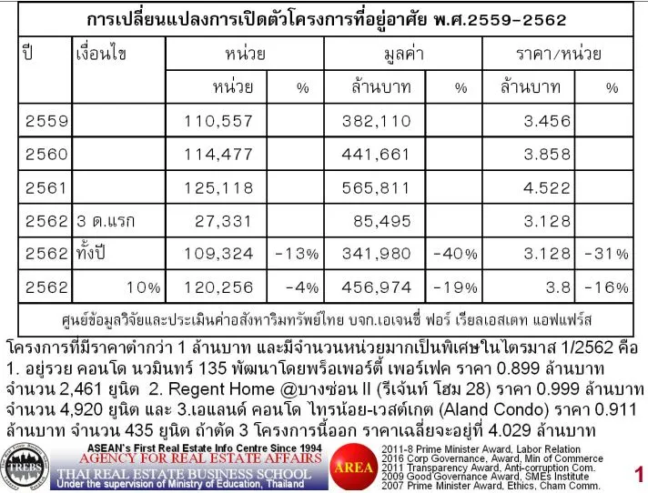 จากข้อมูลล่าสุดของศูนย์ข้อมูลฯ พบว่า ในไตรมาส 1/2562 มีโครงการที่อยู่อาศัยเกิดขึ้นรวมจำนวน 86 โครงการ รวม 27,331 หน่วย รวมมูลค่า 85,495 ล้านบาท เมื่อเทียบกับไตรมาส 1/2561 พบว่าเปิดตัวโครงการ 108 แห่ง ซึ่งมากกว่าปี 2562 แต่จำนวนหน่วยน้อยกว่าคือ 26,970 หน่วย อย่างไรก็ตามปี 2561 มีมูลค่าการพัฒนาสูงกว่าคือ 113,685 ล้านบาท อาจกล่าวได้ว่าราคาหน่วยขายเฉลี่ยในปี 2561 สูงถึง 4.215 ล้านบาท ขณะที่ราคาต่อหน่วยในปี 2562 เป็นเงินเพียง 3.128 ล้านบาทเท่านั้น เพราะในปี 2562 มีการเปิดตัวโครงการราคาถูกเป็นอันมาก