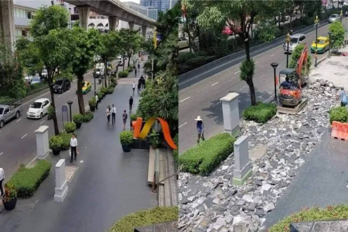 กระทั่งต่อมาเกิดการวิพากษ์วิจารณ์ในสังคมออนไลน์อย่างกว้างขวาง ว่า ขณะนี้ยังไม่ได้รับรายงานเกี่ยวกับเรื่องดังกล่าว โดยจากการสอบถามเบื้องต้นทราบว่า พื้นที่ทางเท้าเป็นของเอกชน ซึ่งผู้ประกอบการได้แจ้งต่อ กทม. ให้ดำเนินการทุบทิ้งทางเท้าเพื่อปรับปรุงใหม่ เนื่องจากทางเท้าดังกล่าวเป็นกระเบื้องขณะเกิดฝนตกทางเท้ามักจะลื่น เกรงว่าประชาชนและนักท่องเที่ยวที่สัญจรไปมาบนทางเท้าได้รับอุบัติเหตุหรืออันตราย