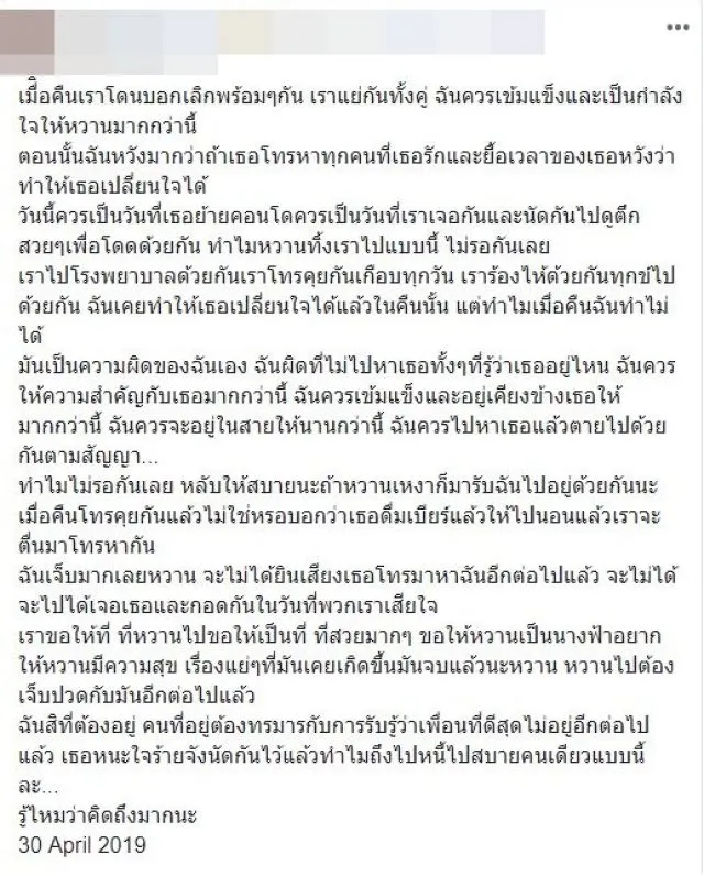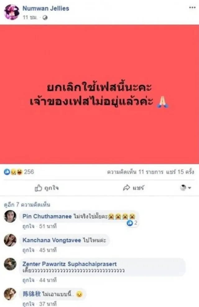 ล่าสุด ตรวจสอบในเฟซบุ๊ก Numwan Jellies ของ หวาน พบว่า ก่อนเกิดเหตุ เวลา 22.12 วันที่ 29 เม.ย. ผู้ตายได้โพสต์เฟซบุ๊กส่วนตัวดังกล่าวว่ายกเลิกใช้เฟสนี้นะคะ เจ้าของเฟสไม่อยู่แล้วค่ะ ท่ามกลางคนเข้ามาคอมเมนต์ช็อกกับเหตุการณ์ หลังทราบข่าว ไม่อยากเชื่อว่าเกิดขึ้นจริง