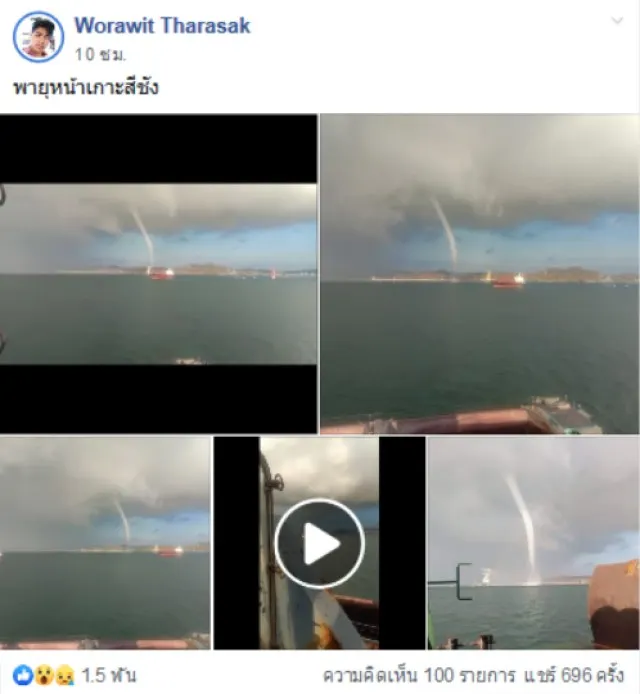 เป็นอีกหนึ่งคลิปที่ชาวเน็ตแห่แชร์ และให้ความสนใจกันเป็นจำนวนมาก เมื่อมีผู้ใช้เฟสบุ๊คชื่อ ศรีราชา ได้ออกมาโพสต์คลิป พายุงวงช้างขนาดความสูงกว่า 30 เมตร โผล่กลางทะเล หน้าเกาะสีชัง ขณะชาวประมงพื้นบ้านออกไปหาปลา สังเกตความผิดปกติเห็นท้องฟ้ามืดครึ้ม ตัดสินใจวิ่งเรือกลับฝั่งอย่างปลอดภัย และสามารถบันทึกภาพเหตุการณ์พายุงวงช้าง ที่ก่อตัวขึ้นกลางทะเลอยู่ไม่ห่างจากเกาะสีชัง จ.ชลบุรี ไว้ได้อีกด้วยก่อนที่จะเคลื่อนตัวหายไปในกลางทะเล