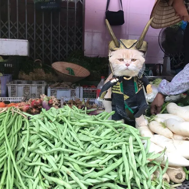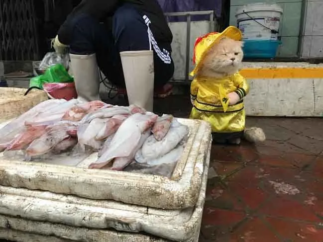 นั่นก็คืแมวสุดน่ารักตัวนี้ ชื่อโช (Chó) แปลว่าหมาในภาษาเวียดนาม กลายเป็นที่ฮือฮาในอินเตอร์เน็ตเพียงชั่วข้ามคืนโดย Le Quoc Phong เจ้าของของมันที่จับมันแต่งตัวและมาขายปลา และเป็นเคยเป็นที่น่าแปลกใจมาแล้วที่แมวตัวนี้มันไม่สนใจปลาเลย แต่มันช่วยกันทำมาหากินโดยมายืนเป็นพรีเซ็นเตอร์ขายปลาอยู่ที่นี่เอง
