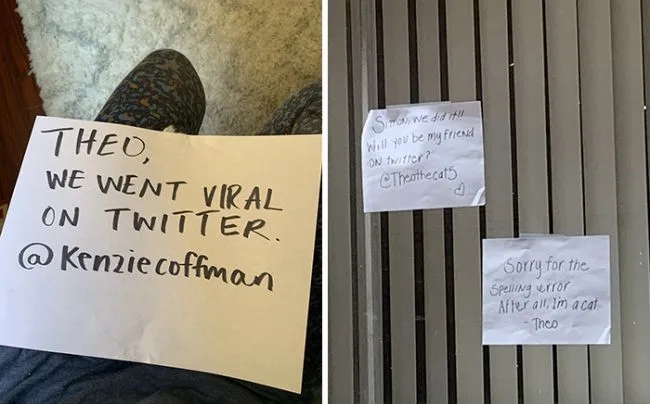 เร็ว ๆ นี้ทวิตเตอร์ ของแม็คเค็นซี่ถูกกดถูกใจและรีทวีตนับพันไซมอนต้องการแน่ใจว่าเพื่อนบ้านของเขาทราบเรื่องนี้ด้วยเธอจึงติดกระดาษอีกด้วยว่า ธีโอ พวกเราเป็นไวรัลทางทวิตเตอร์ไปแล้ว @Kenziecoffman และเธอตอบกลับว่า ไซมอนเราทำได้แล้ว เธอจะเป็นเพื่อนฉันทางทวิตเตอร์ไหม @Theothecat5