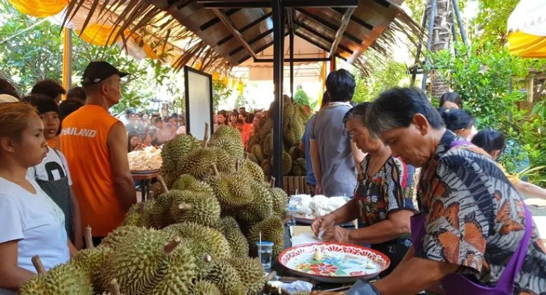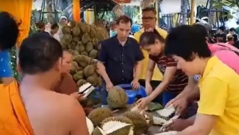 ซึ่งบรรยากาศ ตั้งแต่เช้าตรู่ ก็พบว่ามี ป ร ะ ช า ช น จำนวนมากหลั่งไหลเดินทางเข้ามาที่วัดท่าไม้ จนทำให้การจราจรภายนอกติดขัด ขณะที่บรรยากาศภายในวัดนั้น ทางศิษยานุศิษย์ก็ได้ช่วยกันปลอก ทุ เ รี ย น อย่างขมักเขม้นเพื่อรอแจกให้กับผู้ที่มาร่วมในงานได้ทันตามเวลาที่กำหนดไว้คือ 9 นาฬิกาเป็นต้นไป