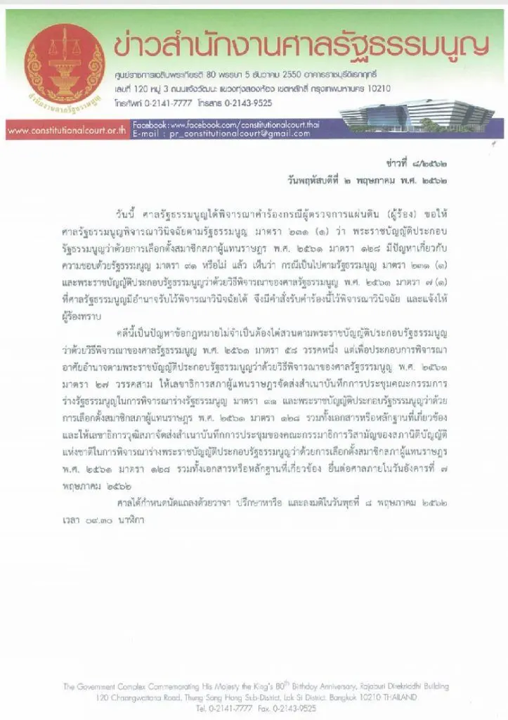 วันที่ 2 พ.ค.62 ศาลรัฐธรรมนูญได้พิจารณาคำร้องกรณีผู้ตรวจการแผ่นดินขอให้พิจารณาวินิจฉัยตามรัฐธรรมนูญมาตรา 231 (1) ว่าด้วยพระราชบัญญัติประกอบรัฐธรรมนูญว่าด้วยการเลือกตั้งสมาชิกสภาผู้แทนราษฎร พ.ศ. 2561 มาตรา 128 มีปัญหาเกี่ยวกับความชอบด้วยรัฐธรรมนูญมาตรา 91 หรือไม่ โดยเห็นว่ากรณีเป็นไปตามรัฐธรรมนูญมาตรา 231 (1) และพระราชบัญญัติประกอบรัฐธรรมนูญว่าด้วยวิธีพิจารณาของศาลรัฐธรรมนูญ 2561 มาตรา 7 (1) ที่ศาลรัฐธรรมนูญมีอำนาจรับไว้พิจารณาวินิจฉัยได้จึงมีคำสั่งรับคำร้องนี้ไว้พิจารณาวินิจฉัยและแจ้งให้ผู้ร้องทราบ