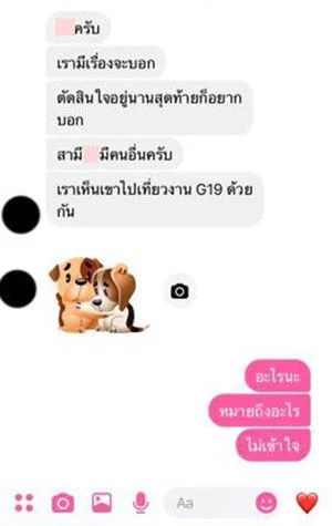 กระทั่งเราท้องได้ 6 เดือน แชตเฟซบุ๊กเด้งขึ้นมา พร้อมข้อความจากเพื่อนคนหนึ่ง บอกว่าสามีเรามีคนอื่น เราไม่เชื่อ ไม่อยากเชื่อ ยังคงหลอกตัวเอง แต่ก็หวาดระแวง จึงล็อกอินเข้าเฟซบุ๊กของเขา จนไปเจอภาพหนึ่ง เป็นภาพมือของชายหญิง ที่เราจำได้ว่าเป็นมือของสามีเรา แต่เรายังปล่อยทุกอย่างผ่านไป