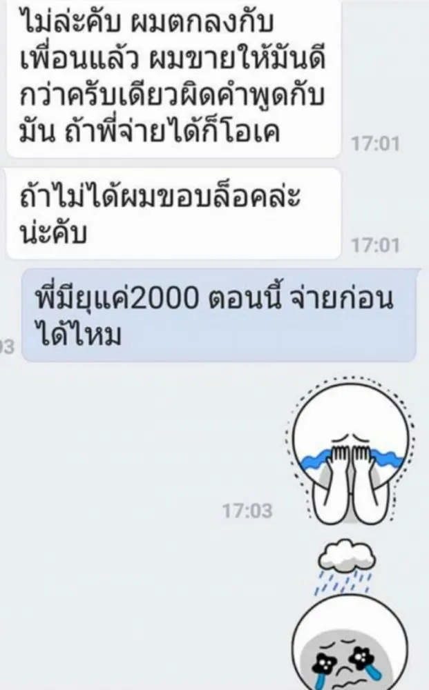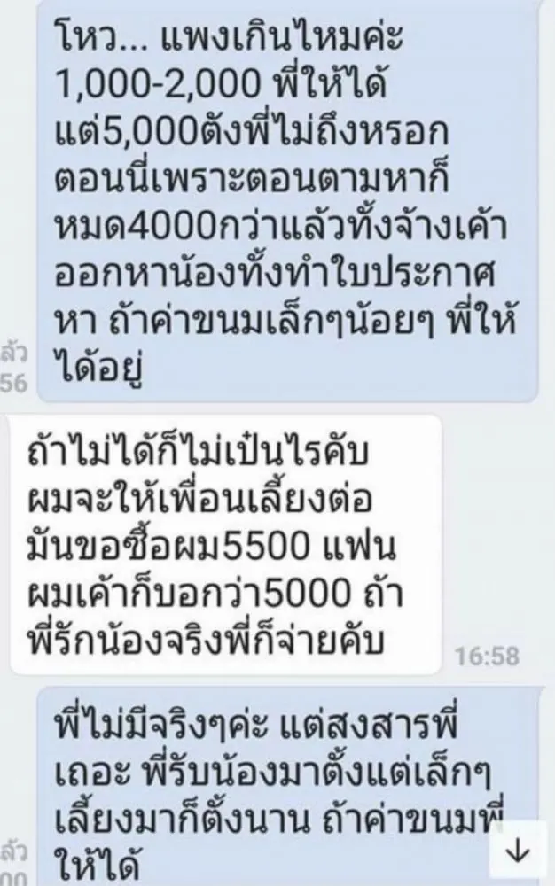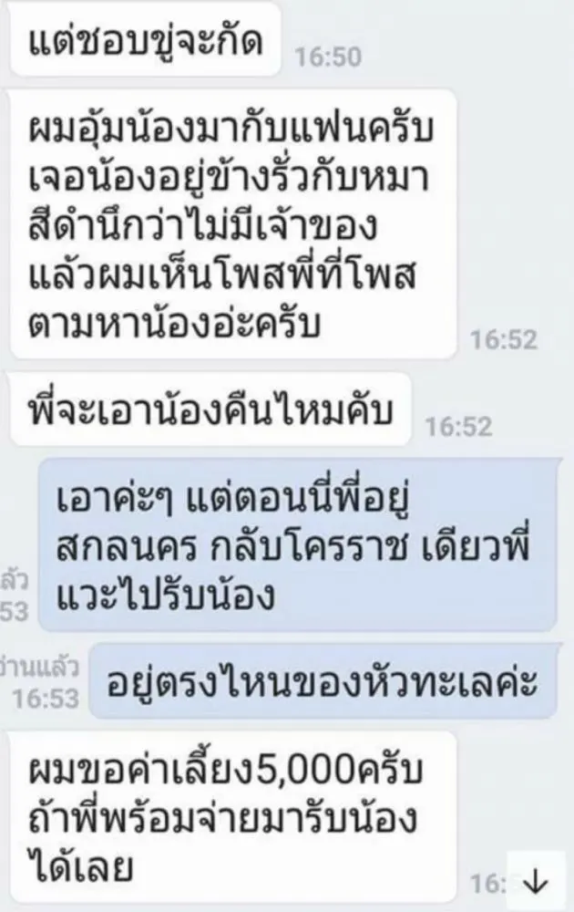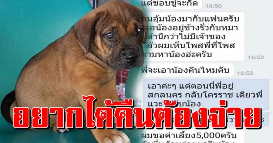 เมื่อเจ้าของสุนัขบอกว่าแพงไป อีกฝ่ายก็ตอบกลับว่าจะจ่ายให้เพื่อนเพราะมาขอซื้อในราคา 5,500 บาท รวมทั้งมีการใช้ประโยคว่า “ถ้าพี่รักน้องจริงพี่ก็จ่ายครับ” จากนั้นก็บอกอีกว่าตกลงจะขายให้เพื่อนก่อนจะบล็อกเธอไป